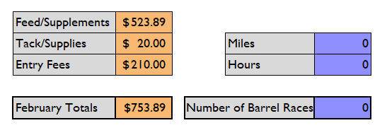 February’s spending was very similar to January: feed and supplements, a trip to the tack store, and another payment for my slot race entry fee. I bought a new latigo and off billet set, as mine was very worn down and a pack of vet wrap.