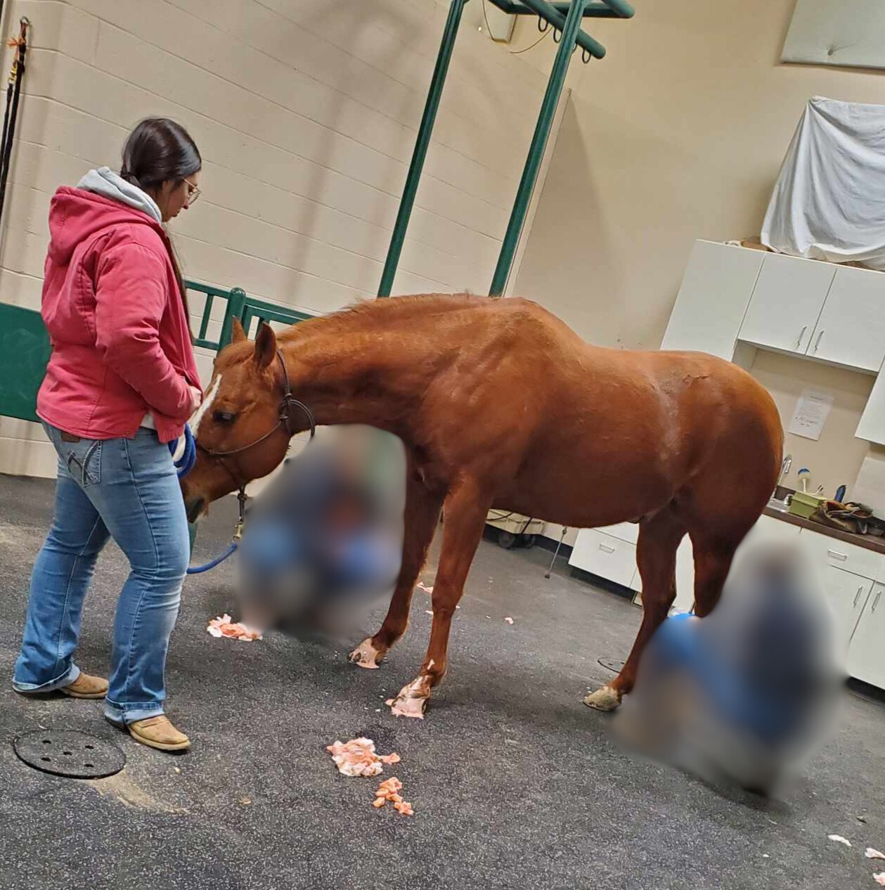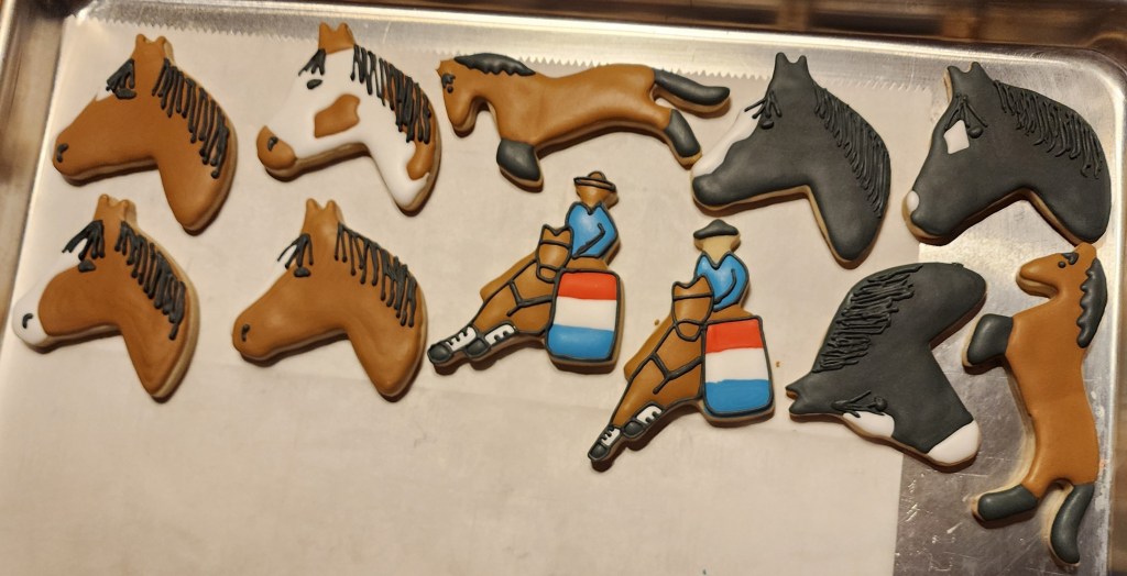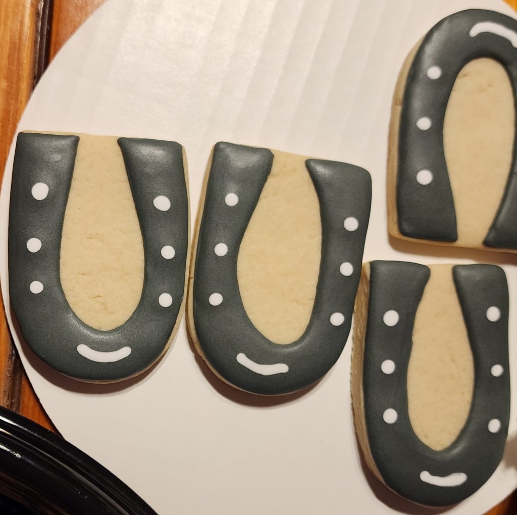 This appointment started out with a repeat lameness evaluation to see where Stinger was at and if there were any changes from last year. There were some good changes and he mostly improved, although the major problems areas were still there. He still has some positive lameness noted in his lower left front and his right hock. He was quite the character this time, he wasn’t afraid of the vet and was very excited to trot off after every flexion. After all the repeat lameness tests were done, Stinger was taken in for the injections. He received injections in his front coffin joints and his hocks. There was some fluid that came out of his coffin joints, and it was more runny than normal, so he definitely needed the injections again. He was a very good patient and then was put into a stall until the sedation wore off. We appreciate our vets so much for everything they do, and we wanted to give them something to show it, so we took homemade sugar cookies that were decorated like horses and horseshoes.