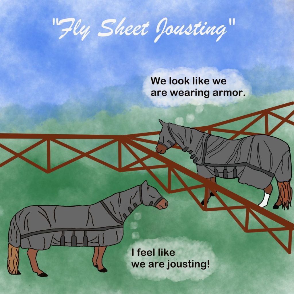 Angus and Stinger both got new matching fly sheets and when they were running in the pasture, it looked like they were jousting. It was so funny watching them run back and forth. This was the moment that gave me the idea to create these comics. See the comic below and the inspiration video and picture!