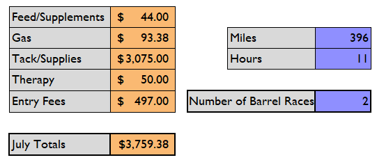 July was an unexpected month as you will see in the next post, so it makes sense that the expenses follow suit. We went to a jackpot and rodeo over the fourth of July weekend, but I was also entered in two other rodeos that we ended up turning out of. I still had to pay these entry fees even though we didn’t run. It was also time to send in our entries for the county fair. The total of $212 includes our camper spot for the week, grounds fee of $5 and entry fee of $2 per class as well as $10 for my lanyard pass to get in the gates. Gas for my half of these trips was $93.38.