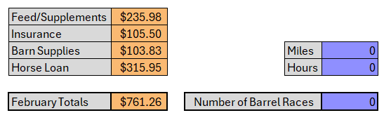 February was a boring month of expenses again. I guess I shouldn’t complain about not spending money with a vet checkup scheduled in March for Stinger. I bought 4 bags of feed at the beginning of the month. Since I’m using about 5 bags a month, I had to get another 4 bags at the end of the month, so I didn’t have to make another trip in a week. It should last for most of March. I also restocked on my gastric supplement and treats. Stinger and Reno really like the Apple Berry Cookie cubes which are forage based and low sugar.