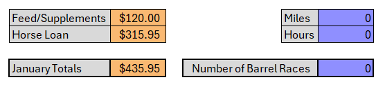 January’s expenses were not very exciting. We didn’t do very much with the temperatures as cold as they were. I am now feeding two horses, and that’s where the majority of the money was spent this month. Stinger is only getting a half scoop of feed while Reno is getting a full scoop. Stinger is not very happy about that, but he doesn’t need any extra energy while he is still on stall rest. I bought 5 bags this month as well as a salt block for in Reno’s stall.