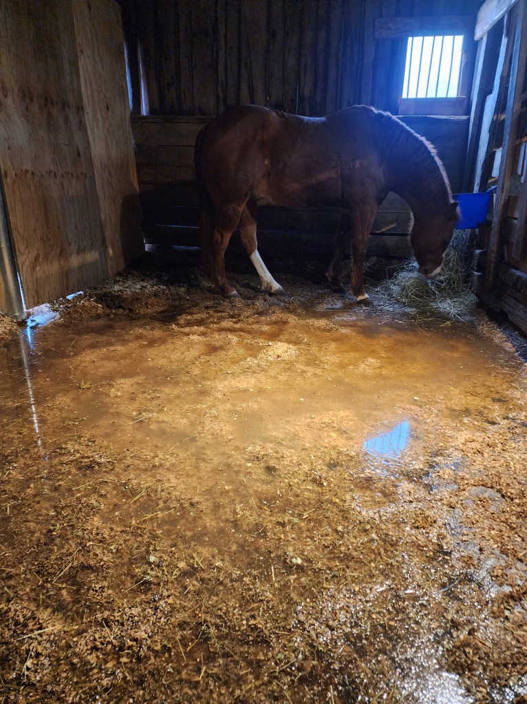 February was a rough month with all the snow melting. Stinger’s new stall was flooding every day for about a week straight because of ice changing the way the water was flowing outside, combined with heavy downpours. Shoveling water out of a stall and pushing it with a wheelbarrow is not as easy as it seems (and don’t plan on staying dry if you hit any bumps). And of course, it would flood when we were almost out of sawdust (waiting for it to stop raining and the ice to melt so we could go get a trailer load), so I had to use a couple bags of sawdust to keep him dry. It was quite a week, and Stinger would try to stay in the one dry corner looking at me really confused about the water invading his space. The day it flooded the worst; I scooped out about 8 wheelbarrows (as full as I could still push them and not spill it all) of water and two more of just wet sawdust. It has been dry since then, so fingers crossed that with the ice melted, the problem is fixed.