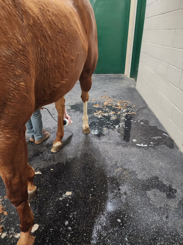 As far as the treatment, we opted for another shockwave session on his hind leg and repeat coffin joint injections for his front feet. There was a good amount of runny fluid that came out during the injection, so he definitely needed them done again (joint fluid should be a more sticky fluid, Stinger’s was like water). We are supposed to continue using the redlight therapy on his hind leg and he was released for turnout in a week (the vet wanted to give his injections time to absorb before he could go out). He was also scheduled for a second checkup two weeks later to see his progress after he had some time outside.