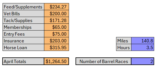 April brought showers and our first rodeo! We went to an open rodeo for slack, with an entry fee of $50. It was about a 1.5 drive to get to the rodeo. Then we made our way to a local show, less than 15 minutes away. I signed up for year-end points ($15) and entered two barrel classes. We also paid our social membership at our local saddle club so we could haul in for practice for $50.
